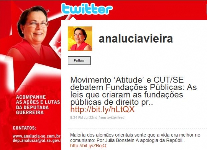 No Twitter, a nova febre da internet, é possível seguir os deputados estaduais Ana Lúcia Menezes (PT) e Mardoqueu Bondano (PR), por exemplo. Em sua página, a petista fala exclusivamente de sua vida política enquanto seu colega na Assembléia Legislativa comenta até resultados de jogos de futebol além de divulgar suas atividades parlamentares. "Acredito muito na democracia do espaço virtual", aposta o pastor Mardoqueu.